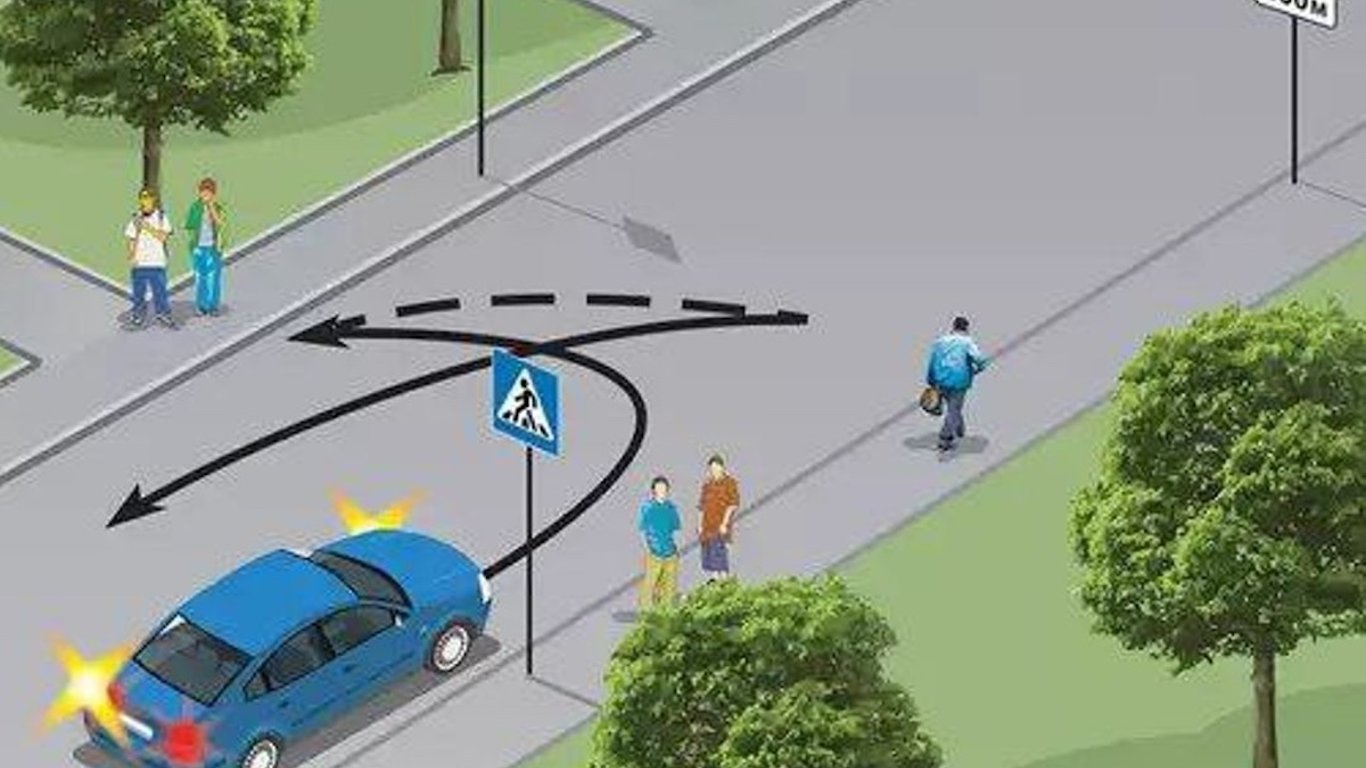 Всі ці маневри він виконує на пішохідному переході, про що свідчить знак 5.38.1 "Пішохідний перехід".