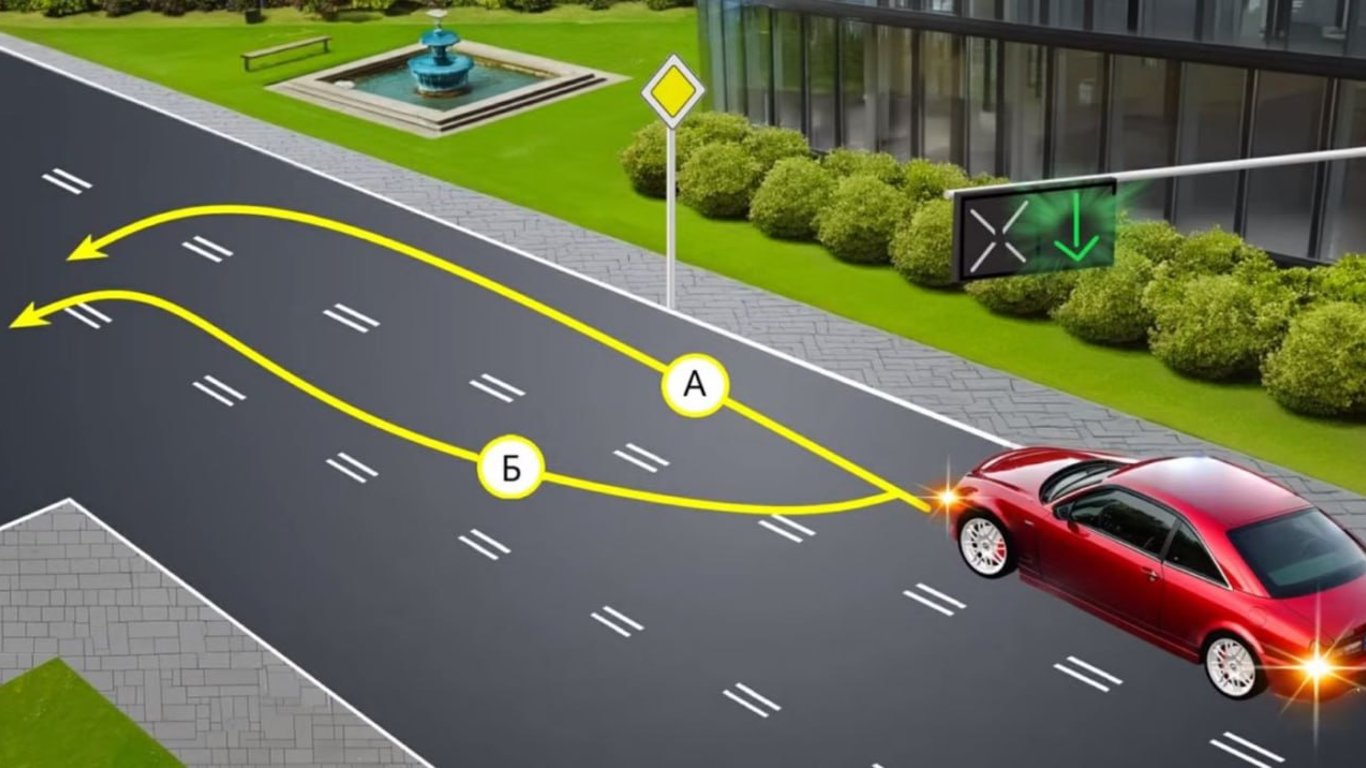 До перехрестя під'їхав червоний автомобіль, водій якого має намір повернути ліворуч. Для цього йому пропонуються дві траєкторії: А — поворот з правої смуги, Б — поворот з реверсивної смуги, що відокремлена відповідною дорожньою розміткою.