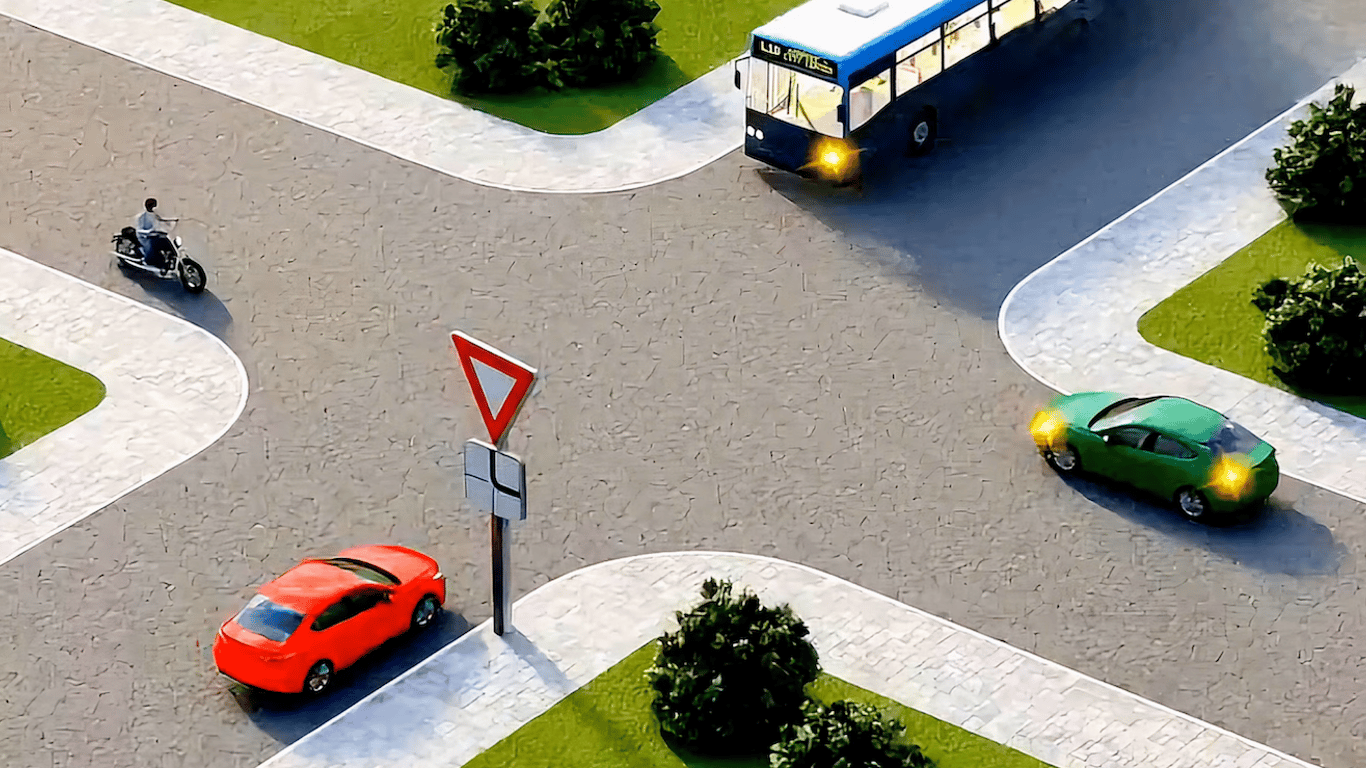 Отже, порядок проїзду перехрестя буде наступним: автобус, зелена машина, червоний автомобіль, мотоцикліст.