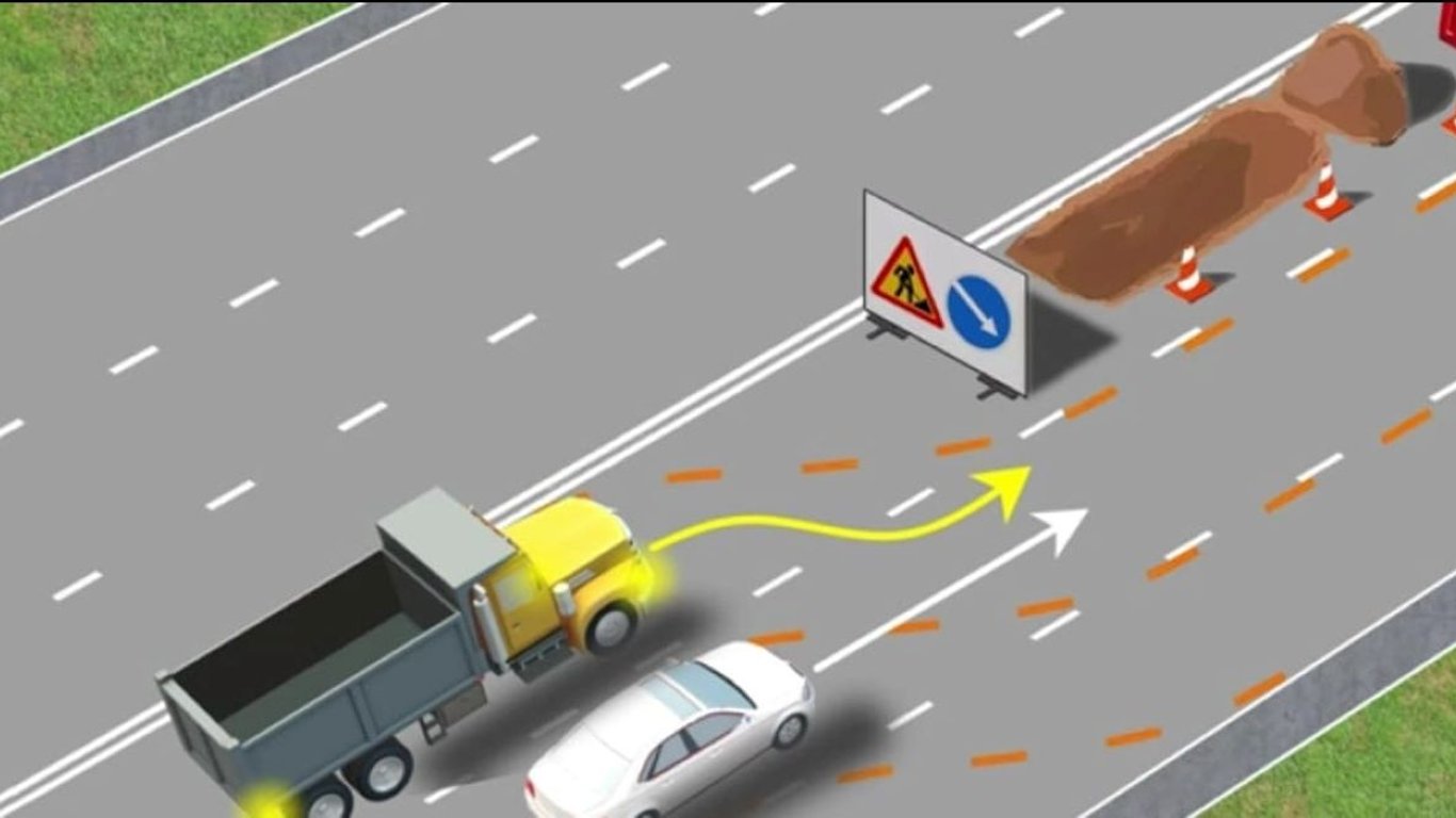 Водій вантажівки об'їжджає перешкоду з правого боку та начебто виконує перестроювання на сусідню смугу, по який вже їде в попутному напрямку білий легковик, а отже, вантажна машина має поступитися.