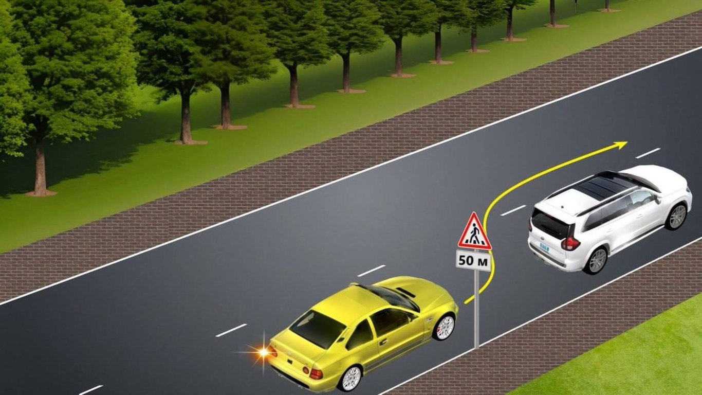 Водитель желтого автомобиля намерен обогнать белую машину. Прерывистая дорожная разметка не запрещает выполнить обгон, но на участке установлен знак 1.32 "Пешеходный переход", который предупреждает о приближении к нерегулируемому пешеходному переходу. Вместе с табличкой 7.1.1 "Расстояние до объекта" это предупреждение говорит, что пешеходный переход находится уже в 50 метрах от места обгона.