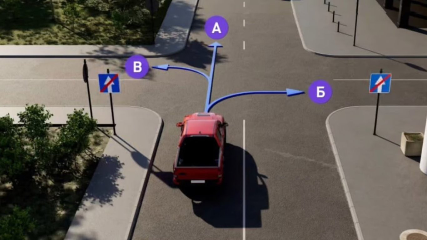 Чтобы повернуть направо (Б), водитель должен заранее занять крайнюю правую полосу, а он находится на левой.