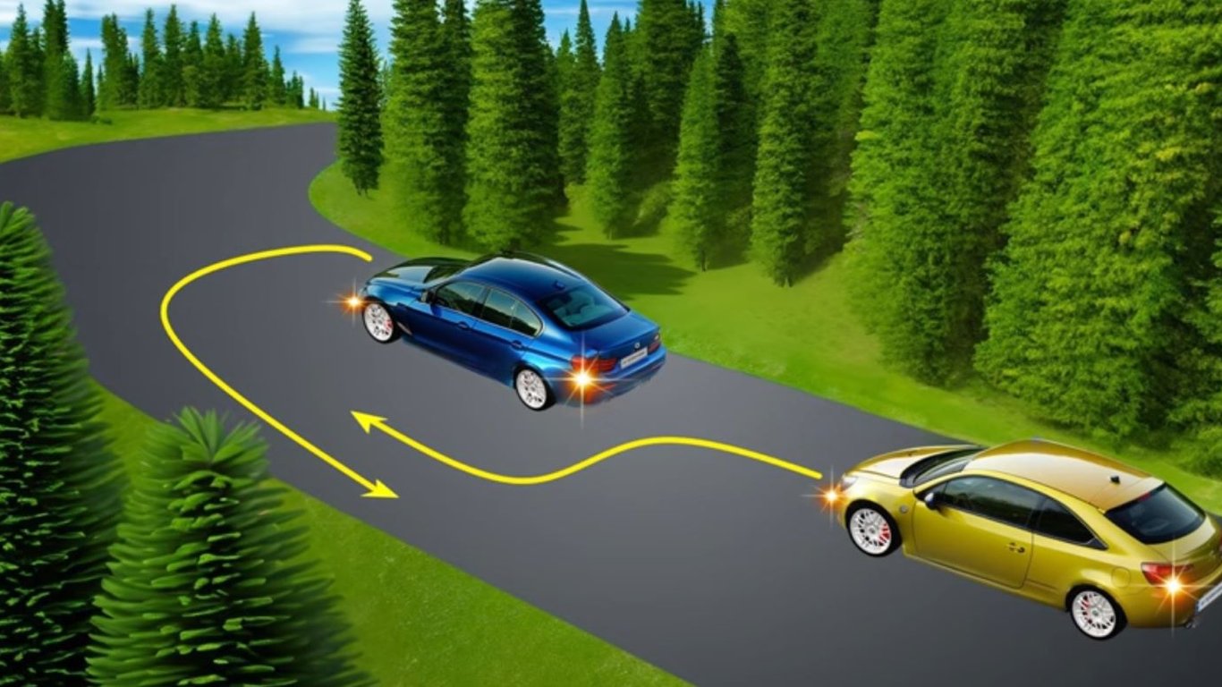 Водитель синего автомобиля намерен развернуться, а водитель желтой машины — выполнить обгон. Оба водителя готовят свои маневры на участке с плохой обзорностью, обусловленной крутым поворотом и деревьями.