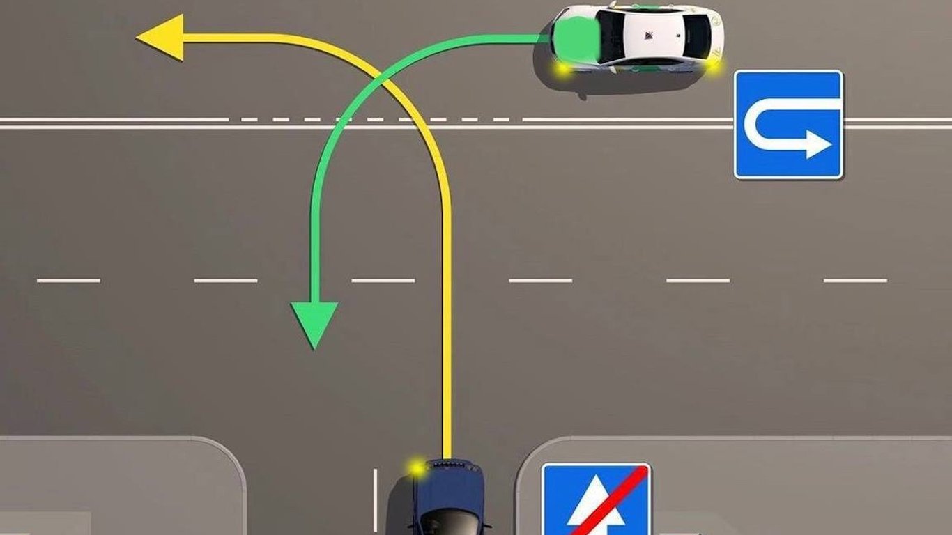 Водитель белого автомобиля видит перед собой знак 5.29 "Место для разворота", и также нарушает правила. Ведь этот знак обозначает место для разворота транспортных средств, а поворот налево запрещает.
