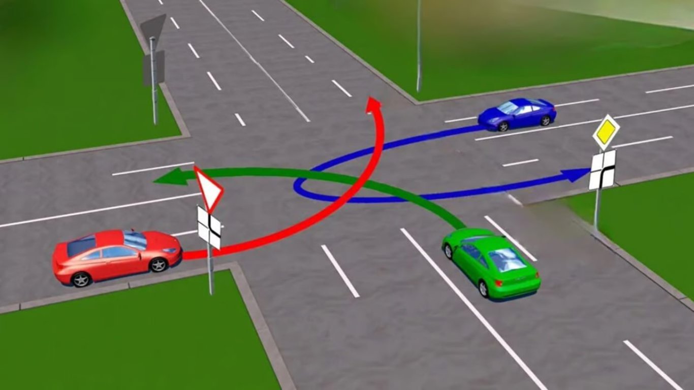 Водитель красного автомобиля находится на второстепенной дороге, о чем свидетельствуют знак 2.1 "Уступить дорогу" и табличка 7.8 "Направление главной дороги". Водители синего и зеленого автомобилей оба находятся на главной (знак 2.3 "Главная дорога").