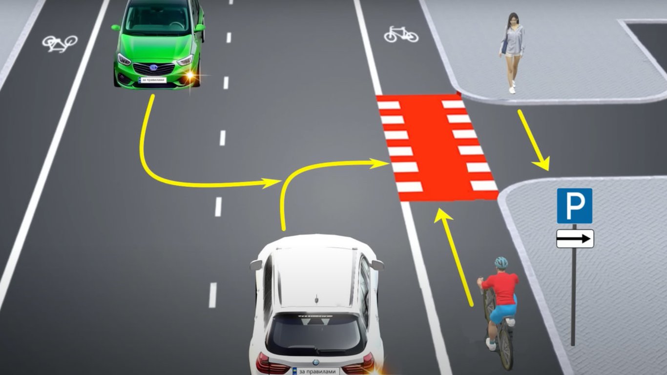 Таким образом оба водителя перед тем как заехать на стоянку должны пропустить велосипедиста и девушку-пешехода.