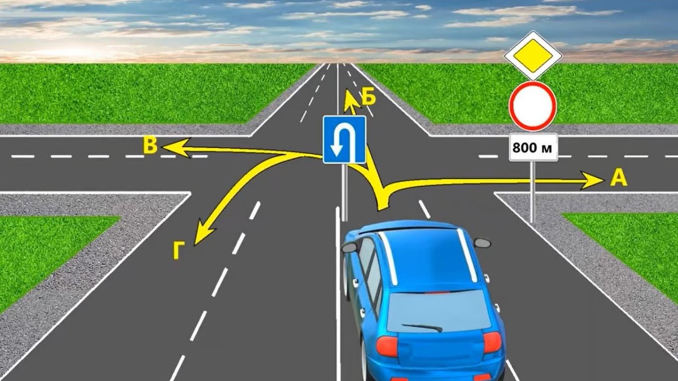 Водію синього автомобіля пропонуються чотири варіанти продовження руху: праворуч, прямо, ліворуч та у зворотному напрямку.