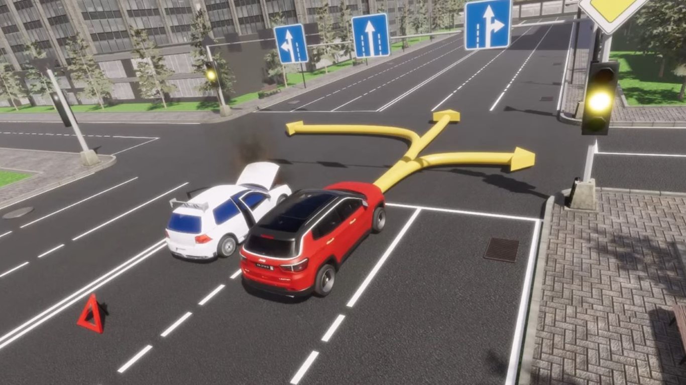 Червона машина під'їздить до перехрестя по центральній смузі. В лівій смузі стоїть зламаний білий автомобіль.