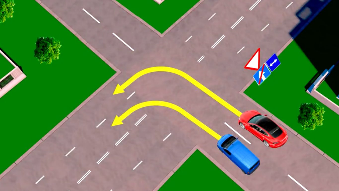Водії червоного та синього автомобілів виїжджають з односторонньої дороги, про що свідчить знак 5.6 "Кінець дороги з одностороннім рухом". Це означає, що в зображеній ситуації вони можуть знаходитися на обох смугах. А далі все залежатиме від їхніх дій.
