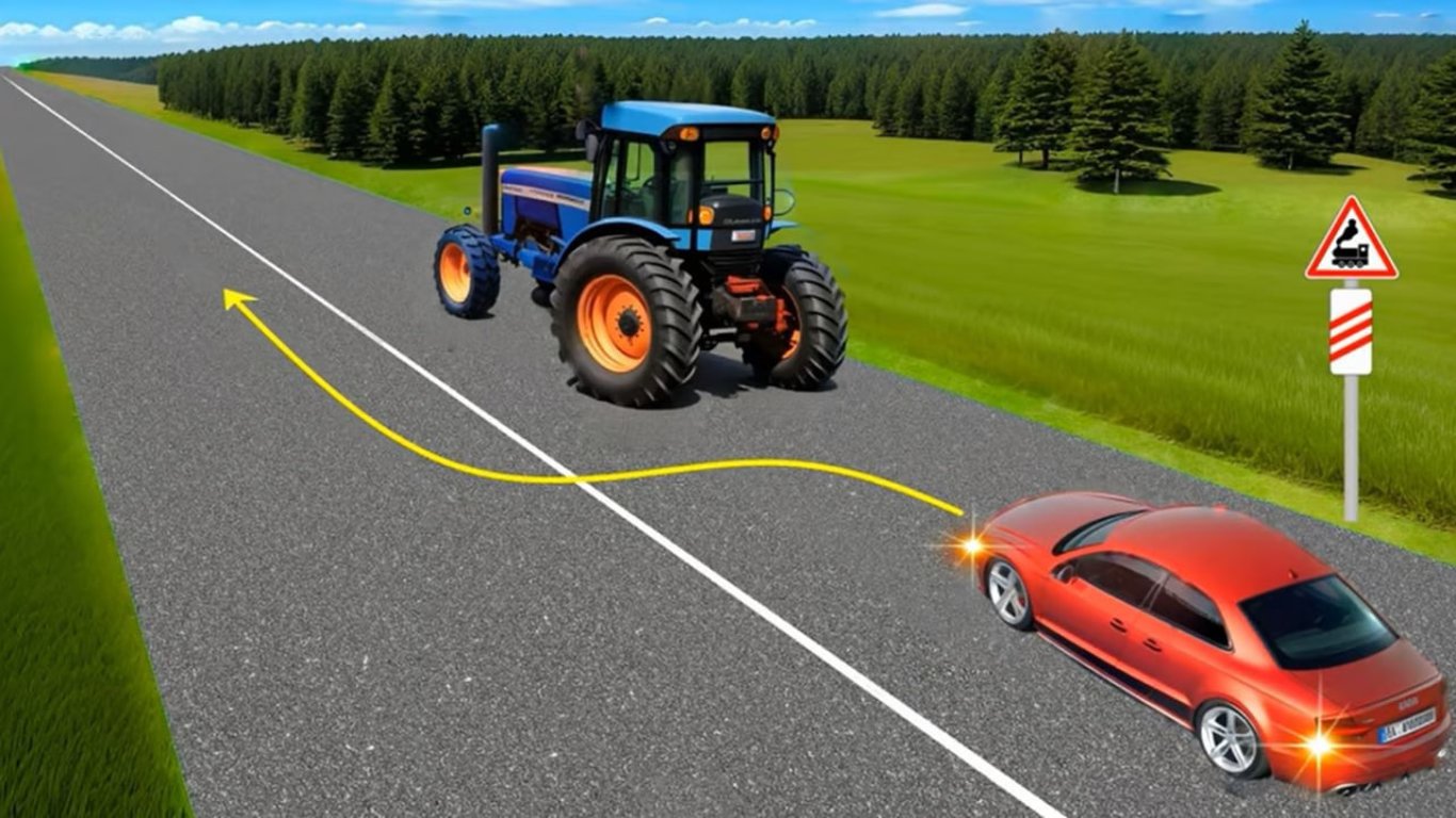 Водій червоного автомобіля має намір обігнати трактор на дорозі, яка має по одній смузі в кожному напрямку. При чому для розділення транспортних потоків використана суцільна лінія розмітки.
